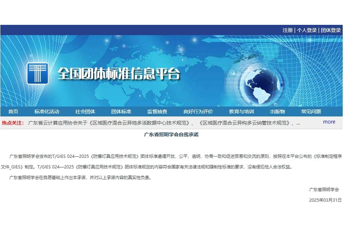 據(jù)全國團(tuán)體標(biāo)準(zhǔn)信息平臺官網(wǎng)消息,廣東省照明學(xué)會近期正式發(fā)布了T/GIES 024—2025《防爆燈具應(yīng)用技術(shù)規(guī)范》團(tuán)體標(biāo)準(zhǔn)。自發(fā)布之日起,該標(biāo)準(zhǔn)正式實(shí)施。